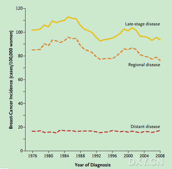 研究人員采用監(jiān)測、流行病學(xué)和最終結(jié)果的數(shù)據(jù)分析了1976-2008年期間≥40歲女性中早期乳腺癌(導(dǎo)管原位癌和局部病變)及晚期乳腺癌(局灶及遠(yuǎn)處病變)發(fā)生率的趨勢。
