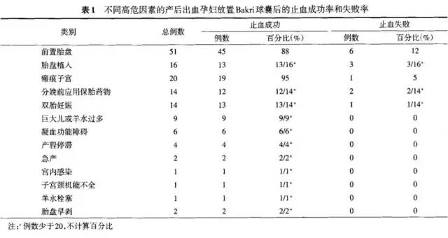本研究以放置Bakri球囊后出血明顯減少,無需另外加用其他有創性止血方法為止血成功并定義為成功組。如放置Bakri球囊后出血仍不能抑制,需引入其他止血方法,如B—Lynch縫合法、子宮動脈結扎術、動脈栓塞術、甚至切除子宮、患者死亡,為止血失敗并定義為失敗組。所有患者產后隨訪2-6個月,了解產后并發癥。對放置Bakri球囊止血成功率進行分層分析,同時評估其安全性。
