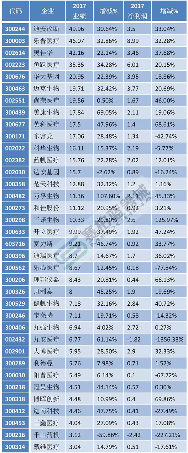 排在首位的是診斷產品渠道商——迪安診斷,2017年收入將近50億,為49.96億元,同比增長30.64%,利潤亦同比增長超過30個百分點。主要得益于該企業能有效運用資本市場工具,加大產融結合能力,增強市場發展能力。