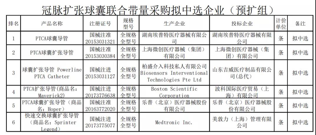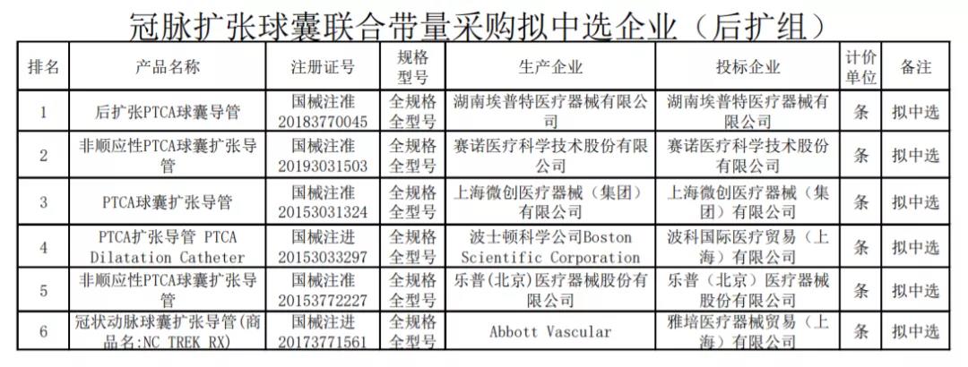 后擴(kuò)組冠脈擴(kuò)張球囊擬中選企業(yè)包括湖南埃普特、賽諾醫(yī)療、上海微創(chuàng)、波科、樂(lè)普、雅培。