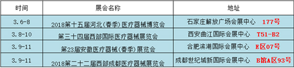 這四場展會分別是“2018第十五屆河北(春季)醫(yī)療器械博覽會”“第三十四屆西部國際醫(yī)療器械展覽會”“第23屆安徽醫(yī)療器械(春季)展覽會”以及“2018第二十二屆西部成都醫(yī)療器械展覽會”。詳情見下表。