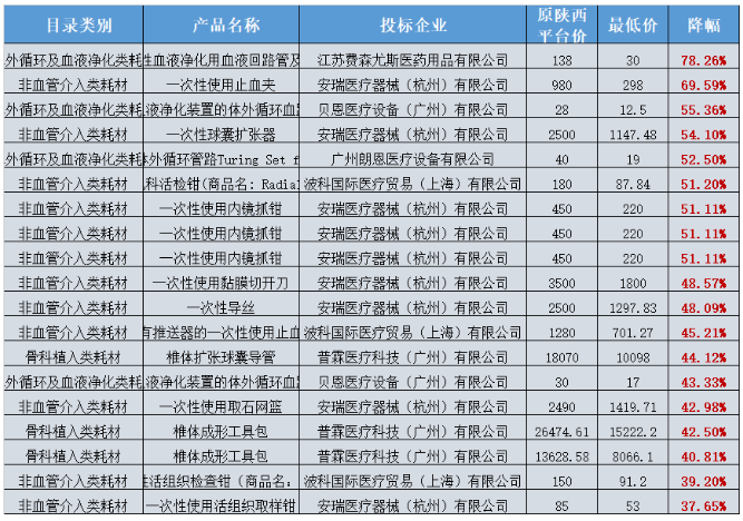 降幅最高的產品是來自江蘇費森尤斯醫藥用品有限公司的一次性血液凈化用血液回路管及附件,原陜西省申報價格為138元,降為30元。