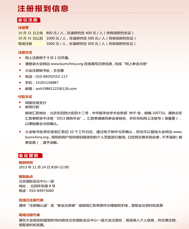 本次會議為中華醫學會一類學術會議,系國家級繼續教育項目,項目編號:2013-04-03-027 (國),全體參會代表可獲得國家級Ⅰ類繼續教育項目學分。屆時國內外著名專家將齊聚北京,針對燒傷專業前沿及熱點問題進行學術交流和探討。文稿被收入會議匯編后,可在當年“中國重要會議論文全文數據庫”中檢索并閱讀。