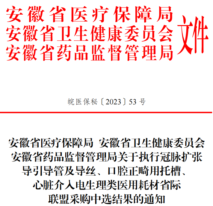 近日,安徽省醫(yī)保局、省衛(wèi)健委、省藥監(jiān)局三部門聯(lián)合發(fā)布“關(guān)于執(zhí)行冠脈擴(kuò)張導(dǎo)引導(dǎo)管及導(dǎo)絲、口腔正畸用托槽、心臟介入電生理類醫(yī)用耗材省際聯(lián)盟采購中選結(jié)果的通知”。