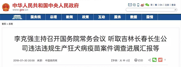 昨日(7月30日),總理主持召開國務院常務會議,聽取吉林長春長生公司違法違規生產狂犬病疫苗案件調查進展匯報。