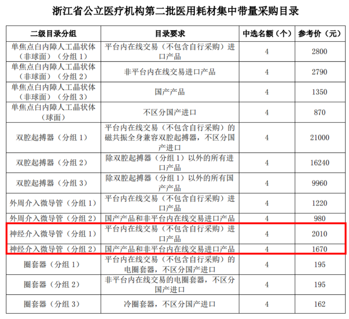 今年9月,浙江省藥械采購平臺公布的省公立醫(yī)院第二批醫(yī)用耗材集中帶量采購目錄中,涉及神經(jīng)介入類產(chǎn)品。