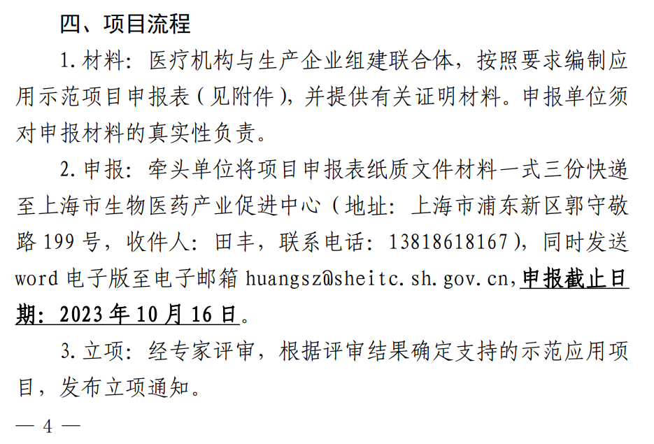 根據《通知》,為加快生物醫藥創新產品應用推廣,支持創新醫療器械在醫療機構開展應用示范,形成“應用示范-反饋改進-水平提升-輻射推廣”的創新迭代,提高上海市創新醫療器械性能質量,推動產業高質量發展,現就開展2023年上海市創新醫療器械應用示范項目申報工作。