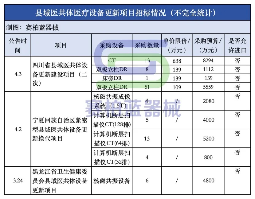 據(jù)賽柏藍器械梳理,湖南、四川、河北、黑龍江、河南、寧夏等多地已先后推進縣域醫(yī)共體設(shè)備更新工作,采購設(shè)備包括核磁、CT、DR、超聲、全自動生化分析儀、生化、救護車等。