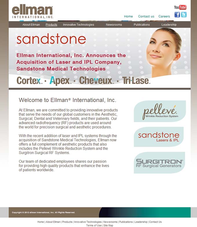 OCEANSIDE,N.Y.-‐-‐July 19,2012–Ellman International,Inc.,a global leader in advanced radiofrequency(RF)technology for precision surgical and aesthetic procedures today announced that it has acquired the assets of Sandstone Medical Technologies, LLC., a recognized leader in the aesthetic laser and IPL technology field. The transaction significantly enhances Ellman’s presence in the aesthetic market with laser and intense pulsed light (IPL) technologies and merges Sandstone’s line of affordable laser systems with Ellman’s aesthetic and surgical RF product portfolio. The financial terms of the deal were not disclosed.
