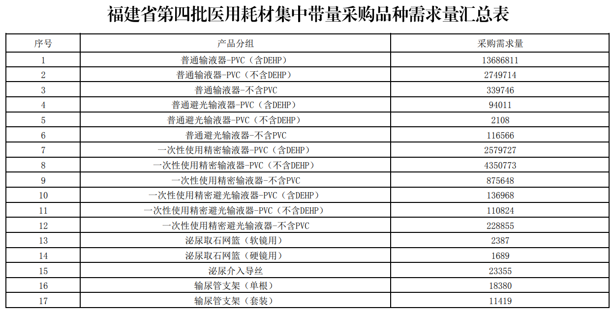 根據(jù)此前發(fā)布的《福建省第四批醫(yī)用耗材集中帶量采購文件(征求意見稿)》,本次集采將圍繞輸液器、泌尿取石網(wǎng)籃、泌尿介入導絲、輸尿管支架等4類醫(yī)用耗材進行開展。