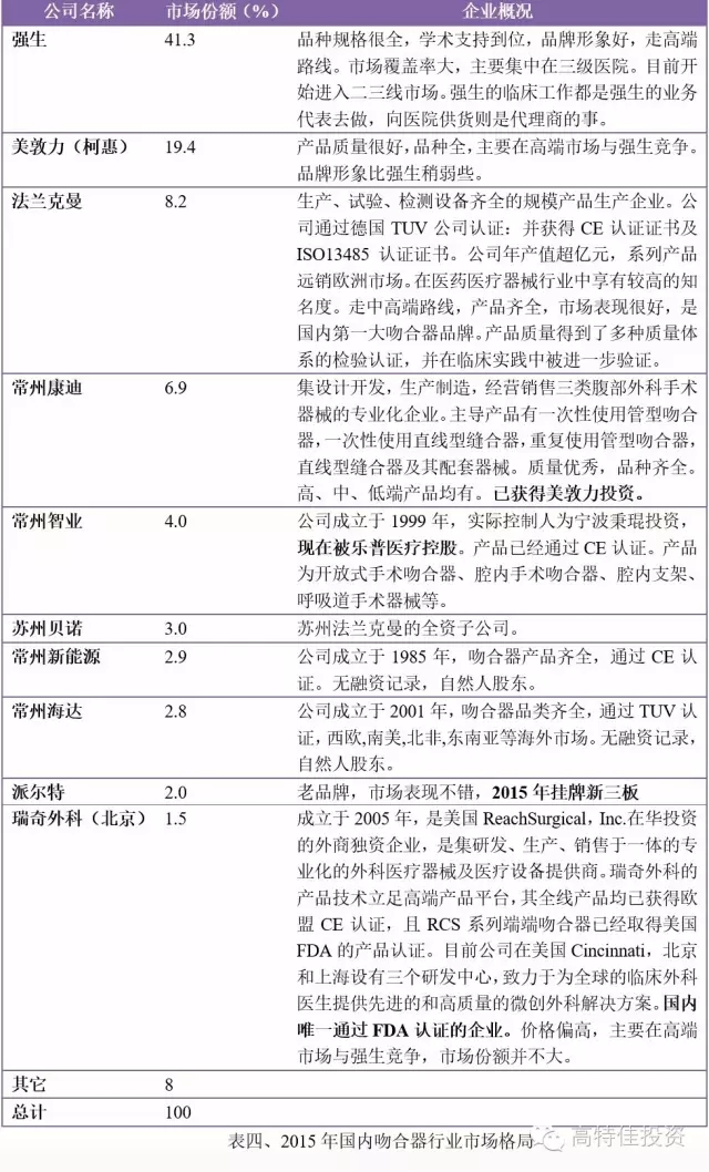 從地域上分,國內吻合器廠商主要分布在江蘇,上海和北京。江蘇常州是國產吻合器的重鎮,常州智業、常州新能源、常州康迪是國內最早生產吻合器的三家公司,早年模仿強生,產品質量不錯,品種規格齊全,產品出口國外,市場競爭力不斷增強。蘇州的法蘭克曼、貝諾、天臣國際三家走中高端路線,法蘭克曼的市場表現非常好。蘇州天臣國際的產品有特色,走高端路線。蘇州貝諾定位于中端品牌,在市場上遇到常州派的激烈競爭。無錫,南京和上海的吻合器廠家市場表現則一般,資金及技術能力有限,整體競爭能力較弱。北京的瑞奇外科,派爾特亦有一定的市占率,派爾特2015年在新三板掛牌。2015年吻合器市場份額如下表所示: