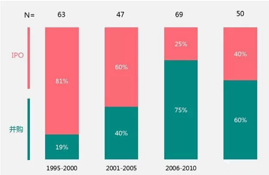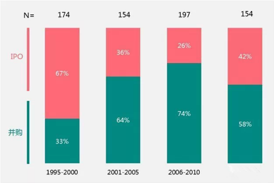而2006-2010年段,在所有規(guī)模的風(fēng)投退出方式中,并購(gòu)方式超過(guò)75%,盡管2013年IPO方式改寫了這一數(shù)字,但仍然未能撼動(dòng)并購(gòu)方式的主導(dǎo)地位,最近的幾年間,在大于2.5億美元的公司或項(xiàng)目中超過(guò)60%以并購(gòu)方式退出,并購(gòu)企業(yè)的含金量已經(jīng)大幅度提升。