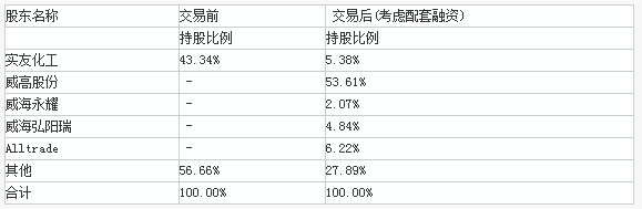 此外,威高股份以其持有的威高物流100%的股權作價14.19億元受讓實友化工持有的上市公司7030萬股股份。