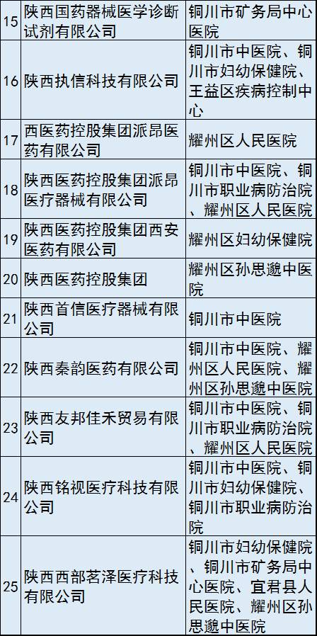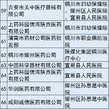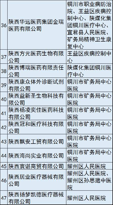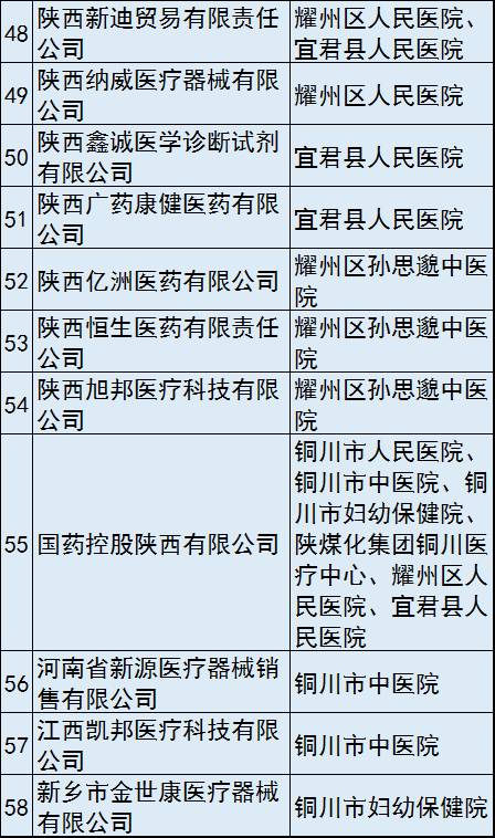有4家醫(yī)院選定了10-15家(含10家)“兩票制”配送商,包括:耀州區(qū)孫思邈中醫(yī)院、銅川市礦務(wù)局中心醫(yī)院、銅川市職業(yè)病防治院、銅川市中醫(yī)醫(yī)院。