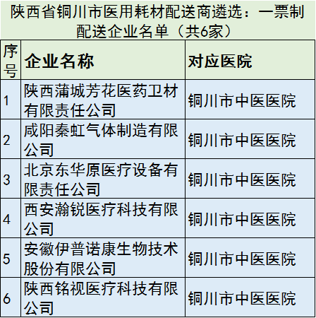 為貫徹落實(shí)藥品、耗材“兩票制”,陜西省銅川市于2016年12月啟動(dòng)了銅川市各級(jí)城市公立醫(yī)療機(jī)構(gòu)藥品、耗材配送企業(yè)公開遴選工作。