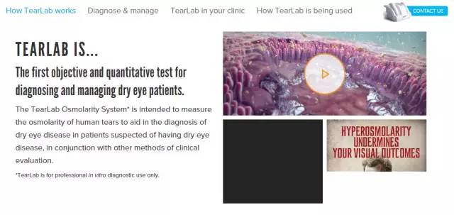TearLab擁有的專利-眼淚測試系統TearLab Osmolarity System,可用于衡量淚膜的同滲容摩,而眼淚同滲容摩則被視作與干眼病具有關聯度的一種生物標記。簡單的說就是一句話, 通過眼淚來診斷干眼病。病人只需用TearLab的儀器采集50nl的眼淚,便可在1分鐘內檢測出干眼病的結果。