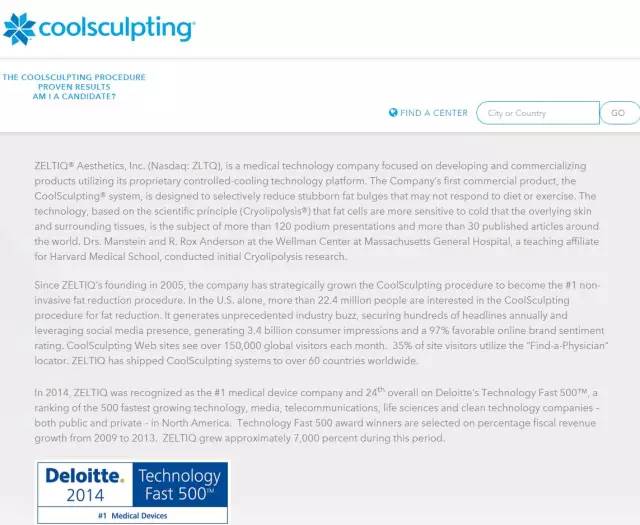 ZELTIQ Aesthetics成立于2005年,是一家醫療高科技公司,總部位于美國加州普萊臣頓,其主營業務是美容減肥產品的研發和商業化運營。