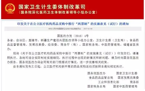 1月9日,國(guó)家衛(wèi)生計(jì)生委體制改革司(國(guó)務(wù)院深化衛(wèi)生體制改革領(lǐng)導(dǎo)小組辦公室)在衛(wèi)計(jì)委官網(wǎng)發(fā)布了印發(fā)《關(guān)于在公立醫(yī)療機(jī)構(gòu)藥品采購(gòu)中推行“兩票制”的實(shí)施意見(jiàn)(試行)》的通知,要求:自通知發(fā)布之日起,公立醫(yī)療機(jī)構(gòu)新開(kāi)展的藥品采購(gòu)活動(dòng)須按照本通知規(guī)定執(zhí)行。