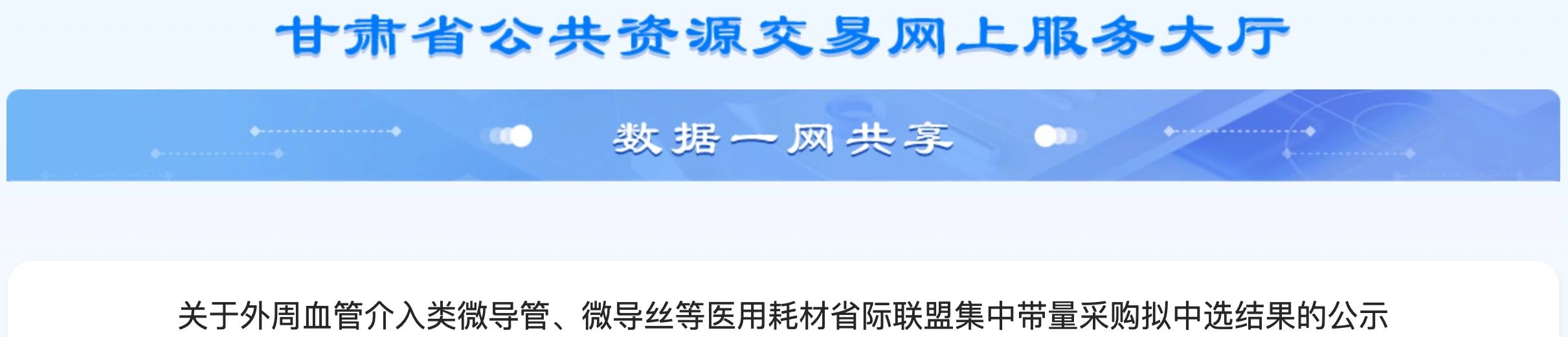 12月27日,甘肅省公共資源交易中心發(fā)布《關(guān)于外周血管介入類(lèi)微導(dǎo)管、微導(dǎo)絲等醫(yī)用耗材省際聯(lián)盟集中帶量采購(gòu)擬中選結(jié)果的公示》。