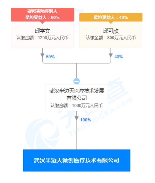 資料顯示,武漢半邊天微創醫療技術有限公司成立于2014年11月,注冊資本為1000萬元,實繳資本僅為50萬元。武漢半邊天醫療技術發展有限公司是其持股100%的控股股東,邱學文是法定代表人、執行董事兼總經理。