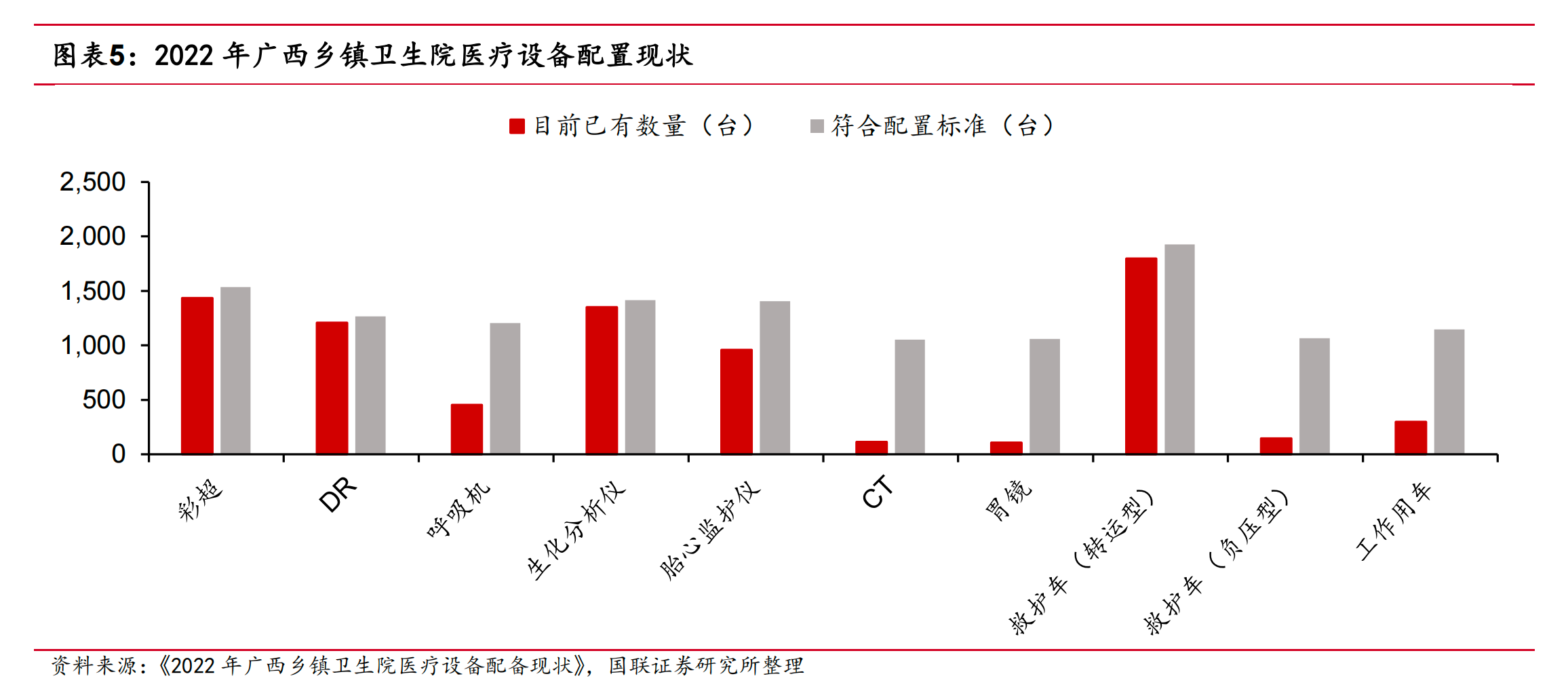 以廣西省為例,根據(jù)《鄉(xiāng)鎮(zhèn)衛(wèi)生院服務(wù)能力標準( 2022 版)》,其鄉(xiāng)鎮(zhèn)衛(wèi)生院基礎(chǔ)醫(yī)療設(shè)備如 CT、胃鏡、救護車和呼吸機等仍有較大缺口。