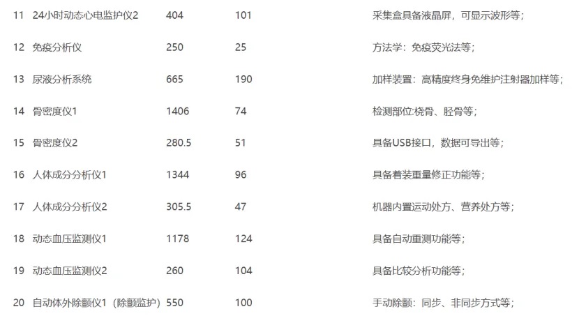 3.選配設(shè)備包括:MR、血液透析機、腦電圖儀、血氣分析儀、骨密度儀,配備數(shù)字化智能化輔助診療、隨訪、信息采集等設(shè)備,配備提供特色醫(yī)療服務(wù)所需的設(shè)備。