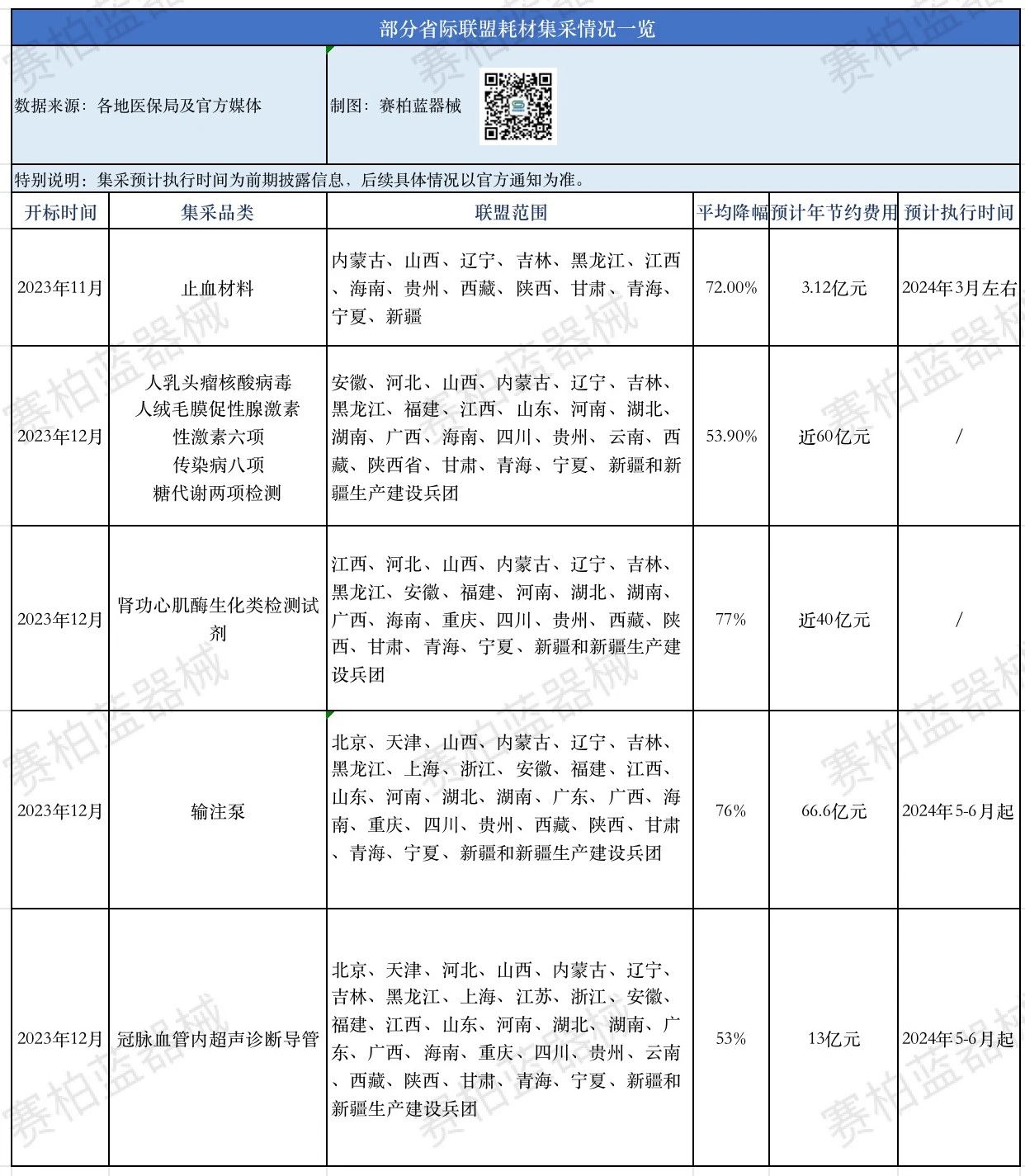 據賽柏藍器械觀察,在剛剛過去的一年間,耗材集采全國擴圍。除前述提到的國采及種植牙集采外,關節骨水泥、冠脈導引導管/冠脈導引導絲、冠脈藥物球囊、止血材料、分子診斷及免疫診斷類試劑、腎功心肌酶生化試劑、輸注泵、冠脈血管內超聲診斷導管等諸多耗材品類在全國多省開展了聯盟集采,中選產品降幅明顯。