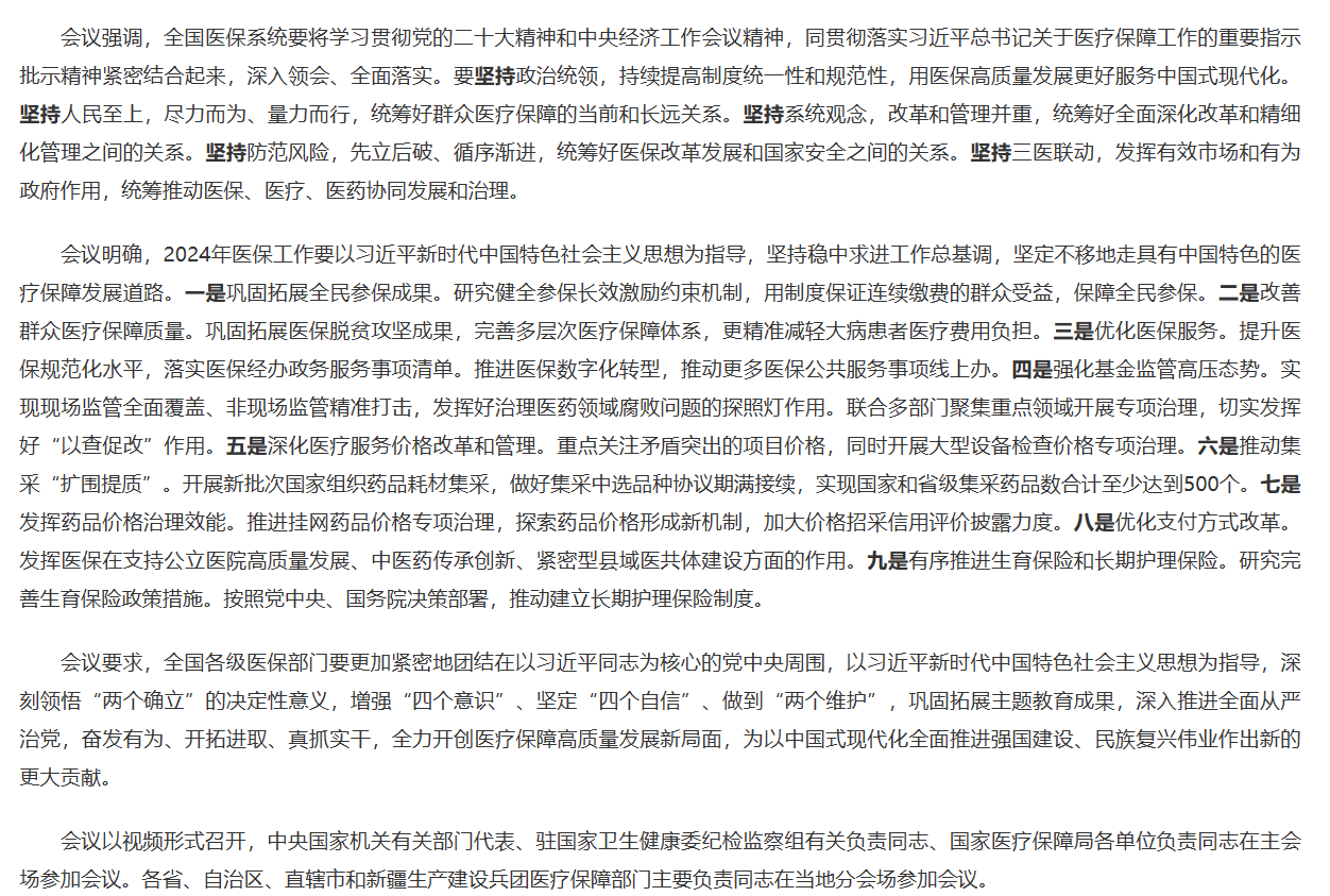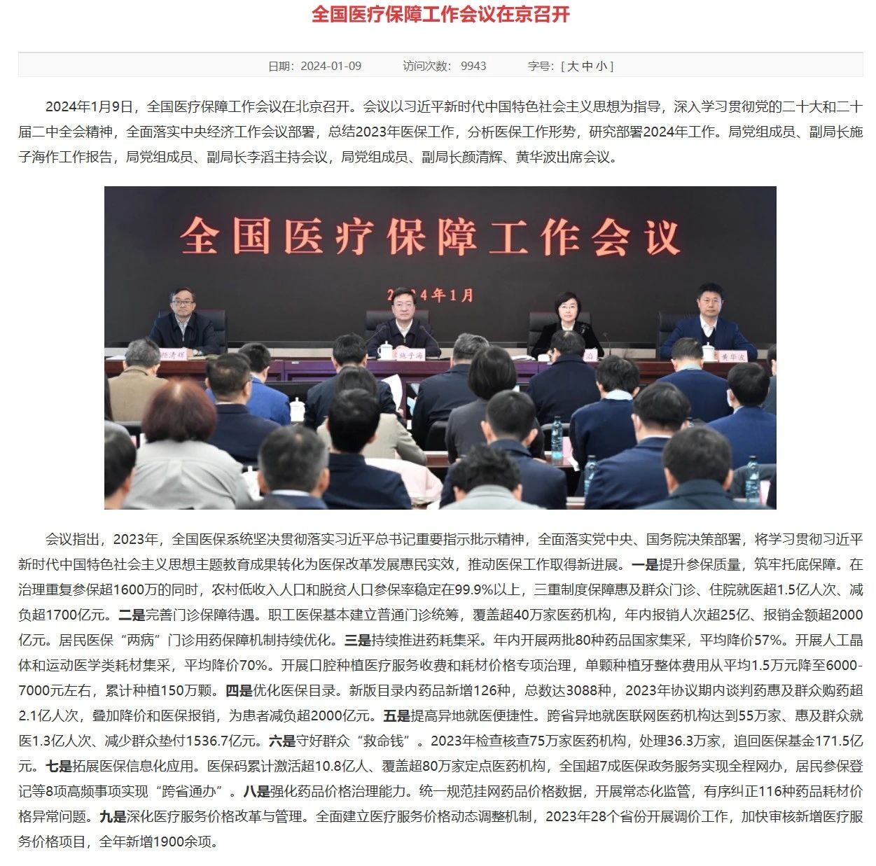 1月9日,全國醫療保障工作會議在京召開。會議總結2023年醫保工作,分析醫保工作形勢,研究部署2024年工作。