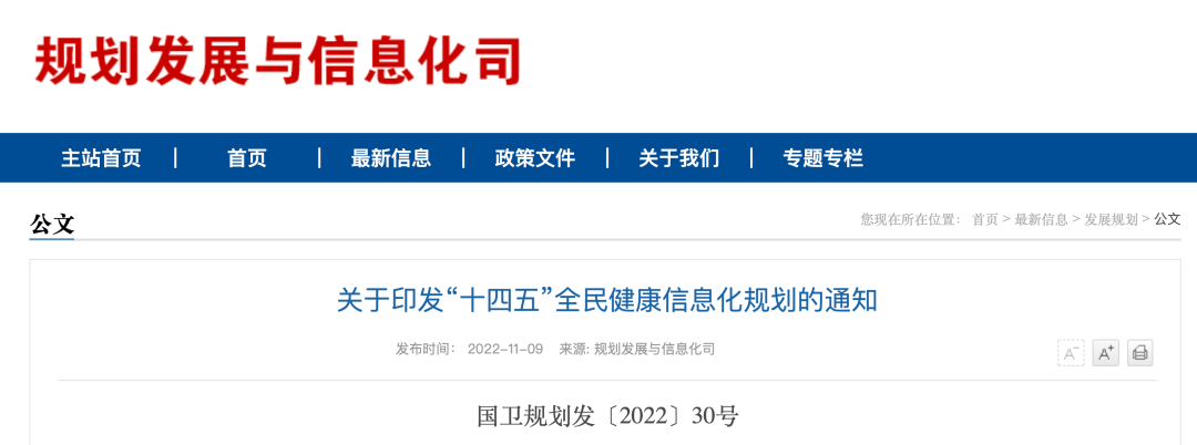 11月9日,國家衛(wèi)健委、國家中醫(yī)藥局、國家疾控局聯(lián)合發(fā)布《“十四五”全民健康信息化規(guī)劃》(以下簡稱《規(guī)劃》),部署八大主要任務(wù)、五項(xiàng)重點(diǎn)工程及八大優(yōu)先行動(dòng)。