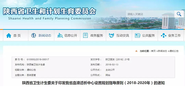 2月28日,陜西省衛(wèi)計委發(fā)布《關(guān)于印發(fā)我省血液透析中心設(shè)置規(guī)劃指導(dǎo)原則(2018-2020年)的通知》。