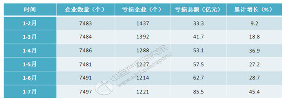 據9月初中商產業研究院數據顯示:截止2018年7月底,我國醫藥行業規模以上企業數量達到7497家,其中虧損企業數量1221家,虧損面16.3%,較上個月提高了0.1個百分點,2018年前7個月醫藥行業虧損總額85.5億元,累計同比增長45.4%。