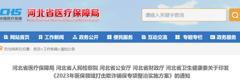 近日,河北省醫保局、河北省人民檢察院、河北省公安廳、河北省財政廳、河北省衛健委印發《2023年醫保領域打擊欺詐騙保專項整治實施方案》(以下簡稱《方案》),決定在全省范圍開展醫保領域打擊欺詐騙保專項整治工作。