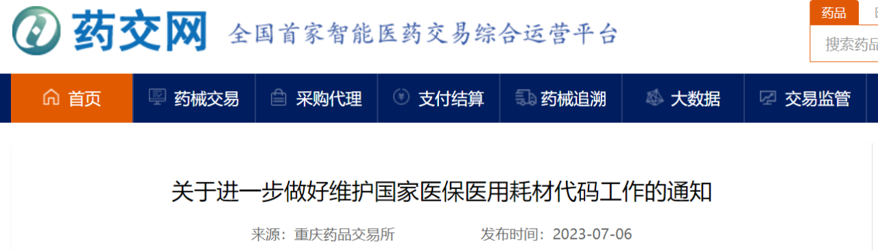 7月6日,重慶藥品交易所發(fā)布《關(guān)于進(jìn)一步做好維護(hù)國家醫(yī)保醫(yī)用耗材代碼工作的通知》。