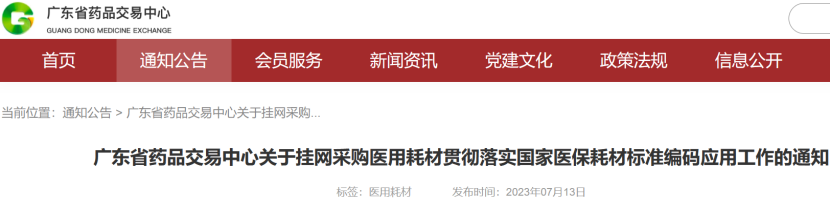 7月13日,廣東省藥品交易中心發布《關于掛網采購醫用耗材貫徹落實國家醫保耗材標準編碼應用工作的通知》(以下簡稱《通知》)。