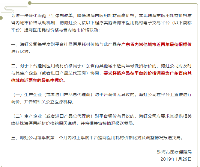 1月30日,珠海市醫(yī)療保障局發(fā)布《關(guān)于實(shí)施珠海市醫(yī)用耗材電子交易平臺(tái)掛網(wǎng)醫(yī)用耗材價(jià)格聯(lián)動(dòng)機(jī)制的通知》。