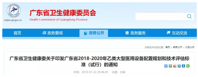 7月22日,廣東省衛健委印發的《廣東省2018-2020年乙類大型醫用設備配置規劃和技術評估標準(試行)的通知》(下稱“《通知》”)顯示,到2020年底,全省規劃配置乙類大型醫用設備1615臺,其中新增813臺。