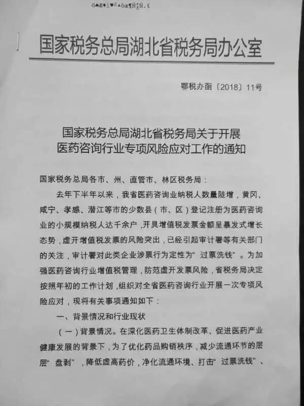 近日,業(yè)內(nèi)流傳一份國家稅務總局湖北省稅務局發(fā)布的《關于開展醫(yī)藥咨詢行業(yè)專項風險應對工作的通知》(以下簡稱《通知》)。(原文件見附件)