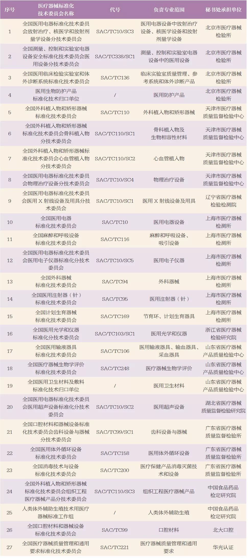 目前,我國已成立24 個醫療器械標準化技術委員會,3 個標準化技術歸口單位。其中全國外科植入物和矯形器械標準化技術委員會有源植入物分技術委員會、全國醫療器械生物學評價標準化技術委員會納米醫療器械生物學評價分技術委員會、醫用增材制造技術標準化技術歸口單位、醫用電聲標準化技術歸口單位、人工智能醫療器械標準化技術歸口單位正在組建中。各醫療器械標準化技術委員會(歸口單位)負責的技術領域和秘書處承擔單位見表1。