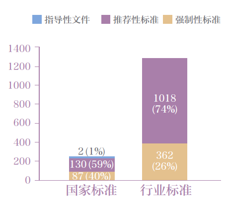 按標準效力劃分,分為醫療器械強制性標準、醫療器械推薦性標準和指導性技術文件。其中,強制性標準449 份,推薦性標準1148 份,指導性技術文件2 份。醫療器械國家標準和行業標準按不同約束程度劃分的分布情況見圖2。