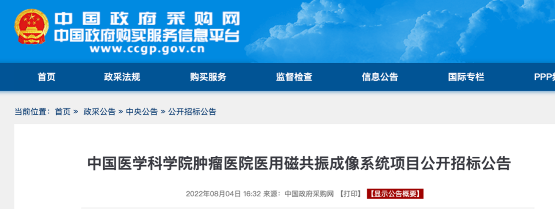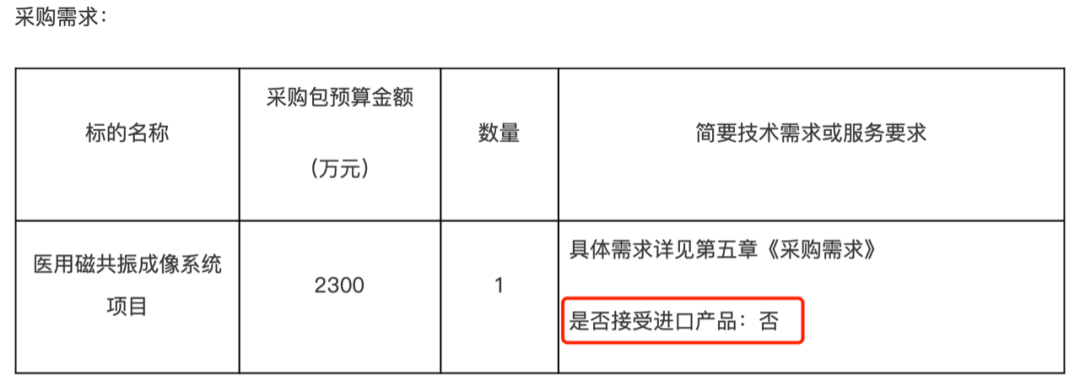 公告稱,中國(guó)醫(yī)學(xué)院腫瘤醫(yī)院預(yù)算2300萬(wàn)采購(gòu)醫(yī)用磁共振成像系統(tǒng),表示不接受進(jìn)口產(chǎn)品。
