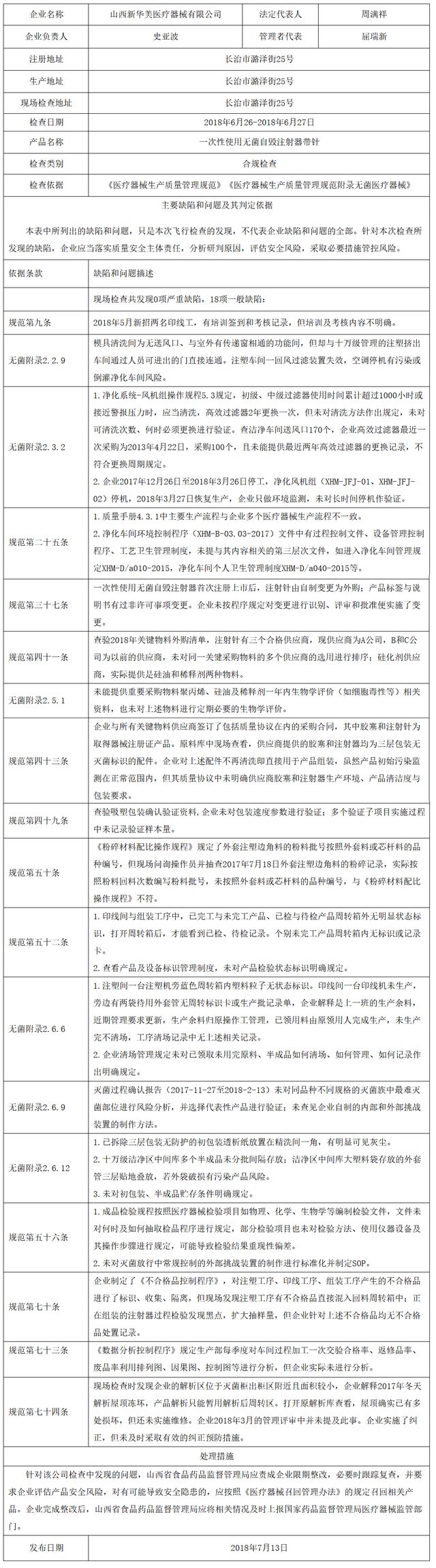 對山西新華美醫療器械有限公司公司飛行檢查通報