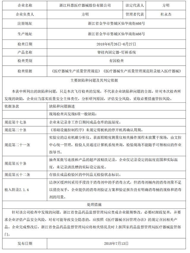 對浙江科惠醫療器械股份有限公司飛行檢查通報
