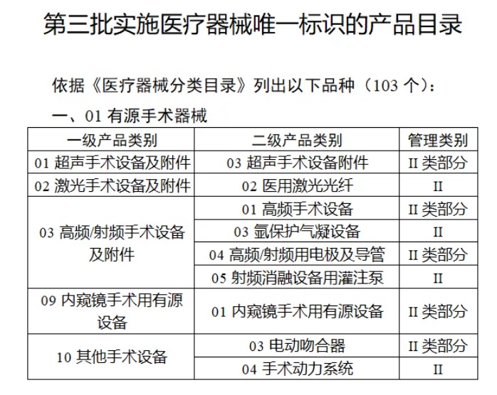 《公告》指出,按照風險程度和監管需要,確定部分臨床需求量較大的一次性使用產品、集中帶量采購中選產品、醫療美容相關產品等部分第二類醫療器械作為第三批醫療器械唯一標識實施品種。