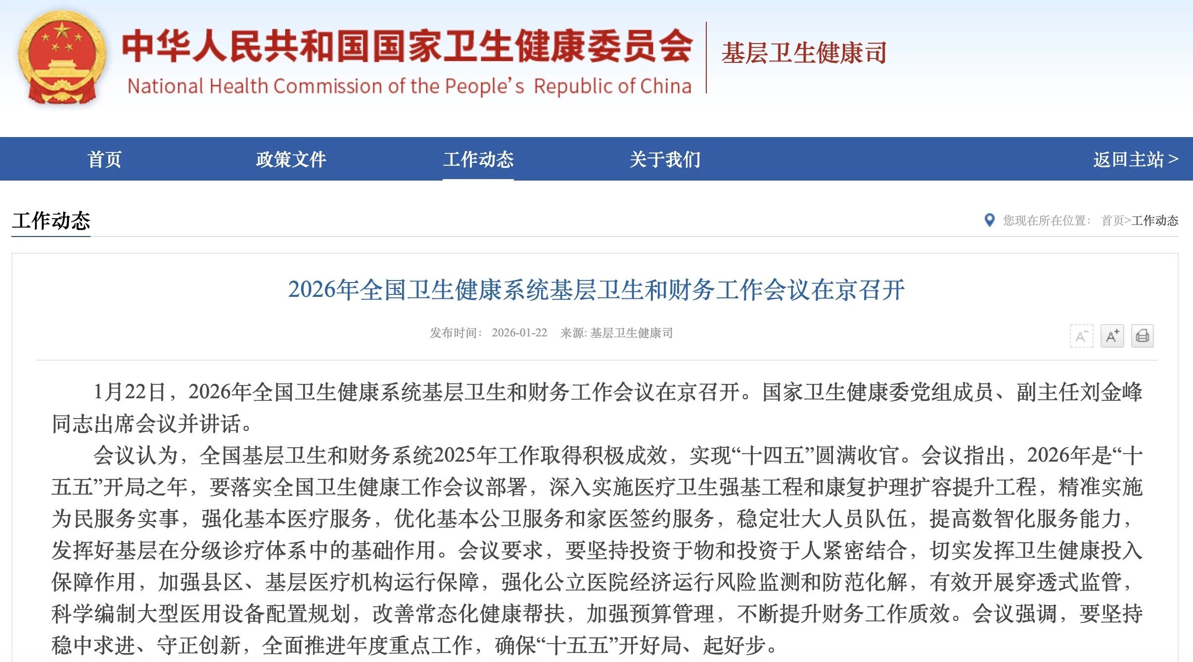 根據(jù)國家衛(wèi)健委消息,2026年全國衛(wèi)生健康系統(tǒng)基層衛(wèi)生和財務(wù)工作會議近日在北京召開,會議披露多項與醫(yī)療器械相關(guān)的重點任務(wù)。