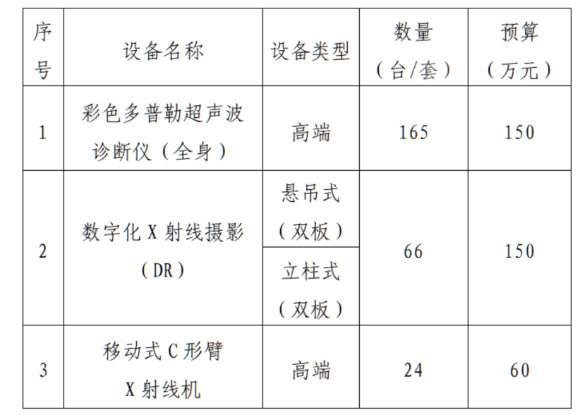 本周內,廣東、河南、江西、山西、湖北、云南等多地醫療設備更新有新消息。近期,山西省衛健委擬于近期組織專家召開設備采購需求參數論證會,并開始征集設備采購需求參數意見。從需求清單來看,彩超、DR等設備需求量較大,總預算達3.6億元。