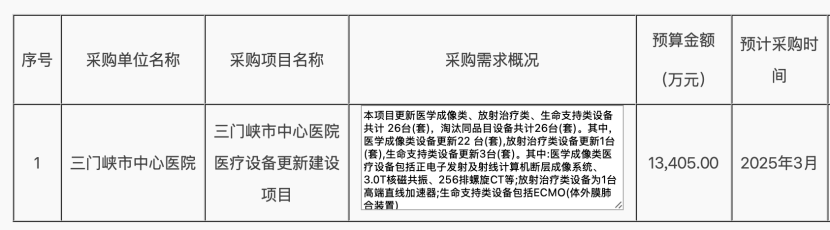 河南三門峽市中心醫院醫療設備更新建設項目預計本月采購,該項目將更新設備26臺(套),包括ECMO、高端直線加速器、3.0T磁共振、256排螺旋CT等高端設備,預算金額1.34億元。