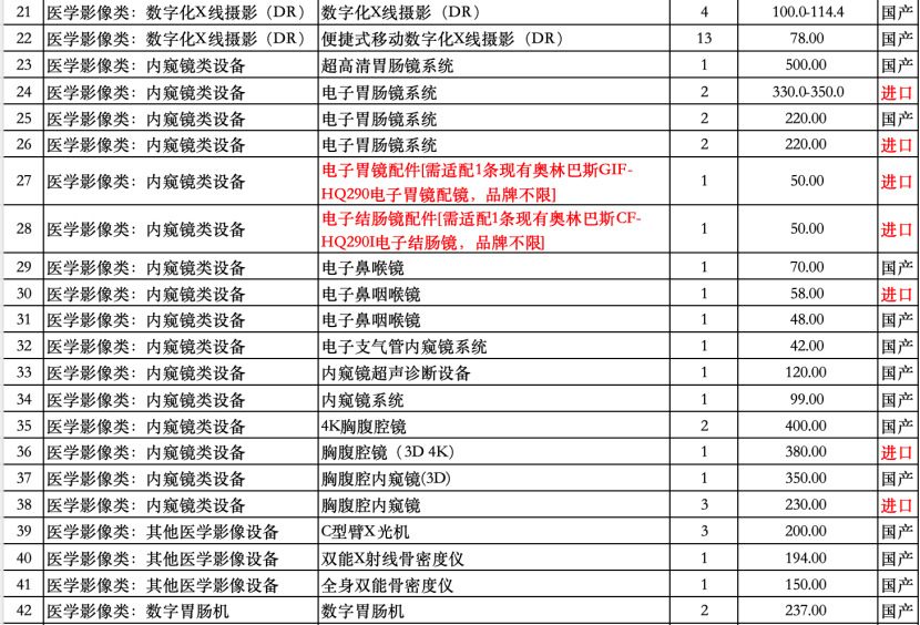 相關公告顯示,采購覆蓋CT、MR、DR、DSA、超聲、內窺鏡、生化分析儀等設備283臺(套),其中明確了國產/進口需求,總預算共計約7.09億元。