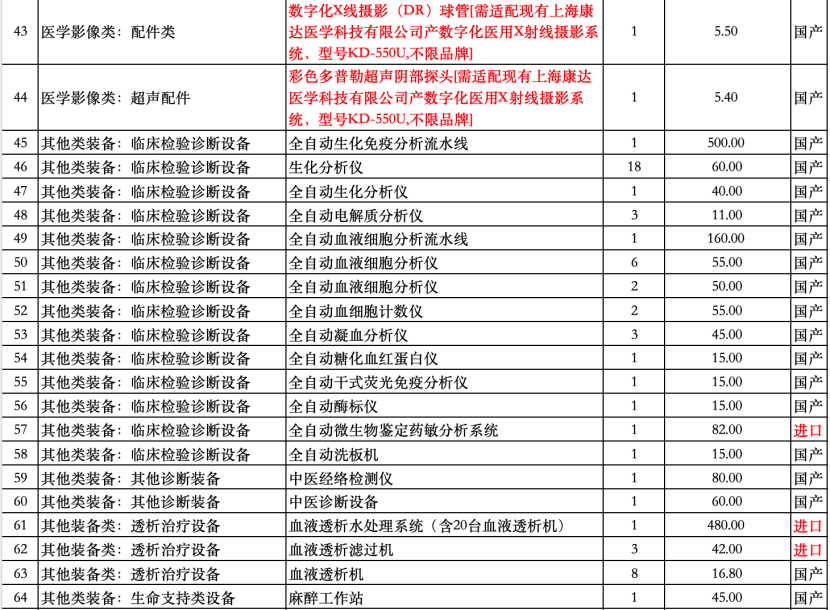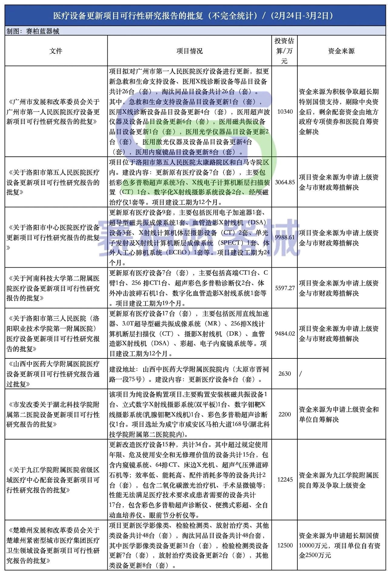 除上述項目外,本周內還有多地公布了對于相關醫療設備更新項目可行性研究報告的批復,具體包括廣州市第一人民醫院、洛陽市第五人民醫院、洛陽市中心醫院、河南科技大學第二附屬醫院、洛陽市第三人民醫院(洛陽職業技術學院第一附屬醫院)、山西中醫藥大學附屬醫院、湖北科技學院附屬第二醫院、九江學院附屬醫院、楚雄州緊密型城市醫療集團等醫療設備更新項目。