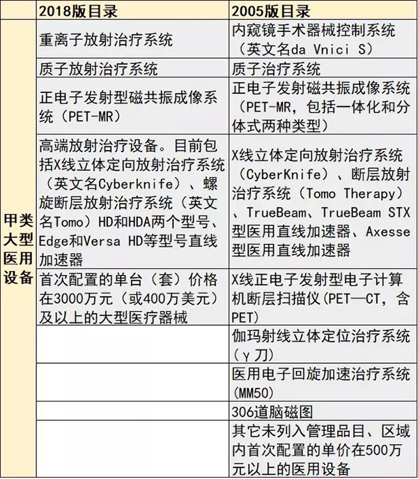2005版目錄對大型醫用設備的界定為“列入國務院衛生行政部門管理品目的醫用設備,以及尚未列入管理品目、省級區域內首次配置的整套單價在500萬元人民幣以上的醫用設備。”