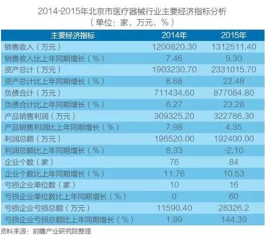 根據國家統計局統計,2015年北京市醫療器械行業規模以上企業數量有84家;實現銷售收入131.25億元,同比增長9.30%;實現產品銷售利潤32.28億元,同比增長4.35%;利潤總額為19.24億元,同比下降2.10%。(具體數據指標詳見下表。)